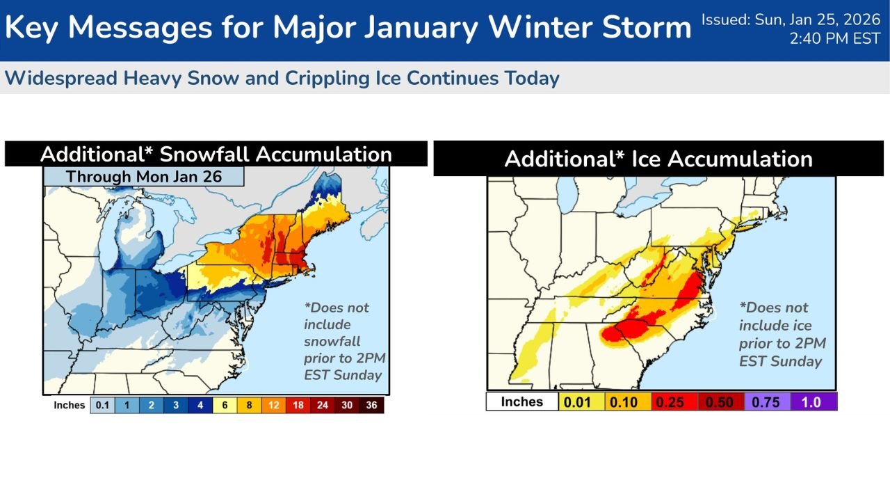 UNITED STATES — A major January winter storm is intensifying across the Northeast and Mid-Atlantic, with heavy snowfall rapidly expanding across Pennsylvania, New York, and New England, while a dangerous ice storm corridor sets up from North Carolina through Virginia and Maryland. Updated forecast maps show two distinct high-impact zones, each capable of causing prolonged travel disruptions and power outages.