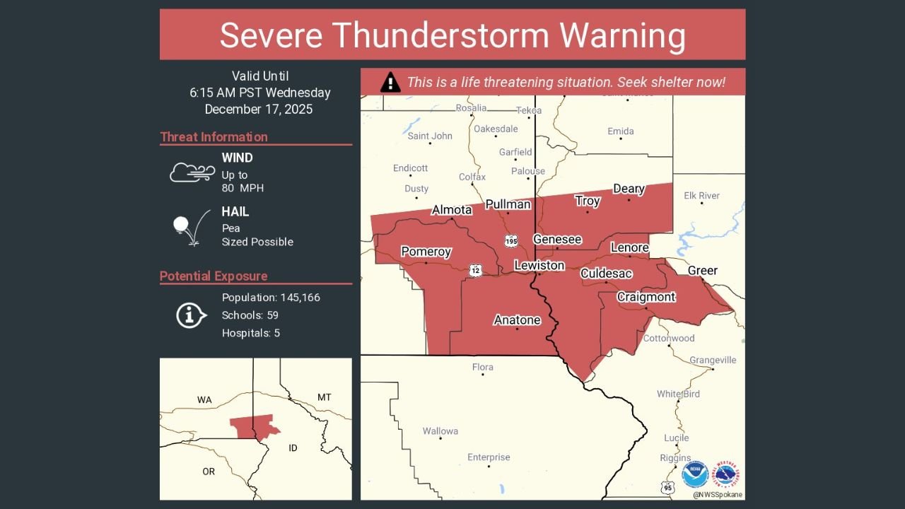 IDAHO & WASHINGTON — A life-threatening severe thunderstorm warning was issued early Wednesday morning for several communities across northwestern Idaho and southeastern Washington, including Lewiston (ID), Pullman (WA), and Moscow (ID).